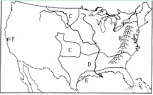 (3)图中E城市位于?沿岸,属于?气候。F城市是?,其东南有世界著名的电子工业中心——硅谷。