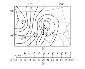 2、单选题 下图为某日08时海平面气压分布图(单位:百帕),图(b)显示④地24小时内风的变化。读图,完成下列问题。