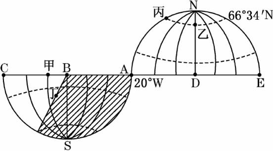 (3)在北半球图上绘出恰当的阴影(表示夜)的部分。(4分)