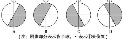小题1:下列四幅图中,与①处当日日出时刻相符的是( )