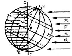 2、综合题 读下图(阴影部分表示黑夜),完成下列问题。(5分)
