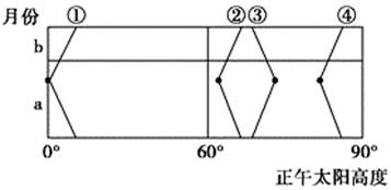 1、单选题 下图是4~8月部分时间不同纬度的四地正午太阳高度变化示意图(a月早于b月),读图回答下列各题。