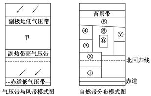 1.左图中受甲风带和副热带高气压带交替控制的气候类型是2.右图中⑧自然带在大陆西岸向高纬方向延伸,其主要影响因素是