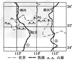 5、单选题 “红三角”经济圈包括江西赣州、广东韶关、湖南郴州的8万平方千米土地。由于三市都属于红色砂砾岩山区,同时也是革命老区,故被称为“红三角”地区。读下图,回答1~3题。