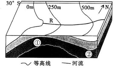 1、单选题 下图为30°S附近沿海某地等高线地形图和地层示意图,R河流正值汛期。读图回答下列问题。