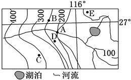 1.由图中等高线的数值可以判断,等高距为50米,湖泊两侧都有河流补给,河流发育处等高线向高处凸出,可以判断E点的海拔大于150米小于200米。