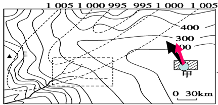 (4)此题考查常见的天气系统。图中虚线为等压线—低压槽,风向在水平气压梯度力和地转偏向力的影响下,风向为东南或偏南(下图)。低压和低压槽——阴雨天气,高压和高压脊—晴朗天气,气压系统移动速度为120km/天,根据图中的比例尺,在24~36小时之间甲城市受低压槽,出现阴雨天气。