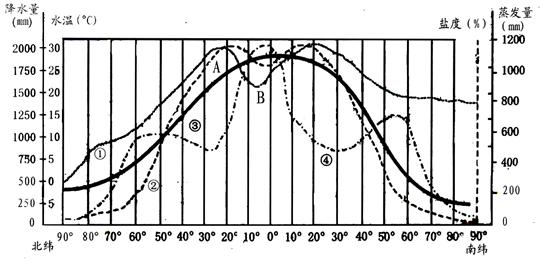 3、单选题 读“年降水量与海洋表面平均温度、蒸发量、盐度按纬度分布图”,读图回答下题。