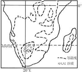 4、单选题 读世界某地区一月等温线图,其中a是25℃,b是20℃,完成17~18题.