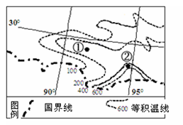 小题1:根据经纬度分布可以判断图示区域位于青藏高原南缘,从图中等积温线分布可以判断,我国该区域的地形特点是地势西北高,东南低,因为海拔每升高1000m气温下降6oC,由此判断积温越低海拔越高。根据积温分布可知①处积温较高,②处积温较低,故①处为山谷,②处所在位置为山脊。