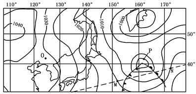 参考答案:1)1000毫巴?(2)P点的气压梯度大于O点(等压线疏密判断);P点为海洋表面,摩擦力小于O点?(3)降雨:晴→雨→晴→雨→晴;气温:冷→暖→冷;风向:偏西风→西南风→东南风