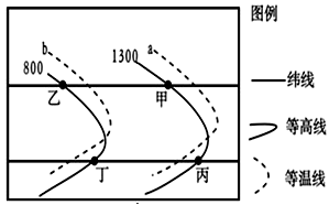 【小题1】根据海拔高度变化,等温线a的温度低于b。丙地与甲地位于同一海拔高度,但是甲地的温度高于丙地,同理,乙地气温高于同一海拔的丁地。根据等高线凸出方向判断是山谷地形,也就是说同一海拔山谷北坡气温高于山谷南南气温,所以甲乙位于北半球的阳坡,A可能。丙、丁位于南半球的阳坡,B不可能,选B。甲地较丙地纬度低,气温较高,C可能。乙地较丙地海拔低,气温较高,D可能。