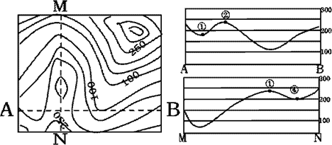 小题1:从等高线示意图分析,沿AB线,两条线的交点两侧等高线凸向高值,说明其两侧地势较低,应为山谷,则交点处地势较高,所以对应右图中的②点;沿MN线,该点两侧较高,均在250m以上,则交点处地势较低,对应右图中的④点,故选D。