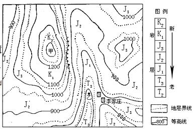 3、单选题 读某区域等高线和地层分布示意图,完成下列各题。