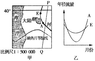 4、单选题 下面甲图中PQ为晨昏线的一部分,图示陆地地势较为平坦;乙图中的年径流量曲线是从甲图中A、E两处测得的。读图回答1~2题。