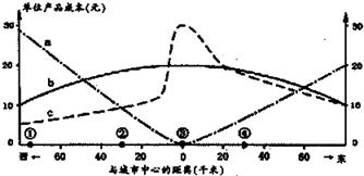 小题1:土地成本的基本分布规律:市中心最高,之后向外递减,且交通便利的地方,地价较高,故判断为c线;运费的分布特征:距市中心最近,运输距离最近,故运费最低,逐渐向外递增,故判断为a线;