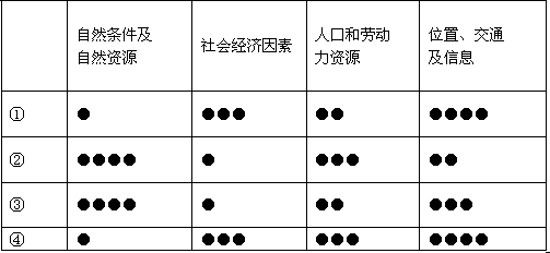 1、单选题 下表表示影响四个区域经济发展的区位因素(●的多少表示优势的大小),读后判断下列各题。