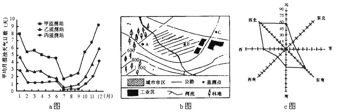 (3)若b图中A、B、C为a图中甲、乙、丙三个监测站的分布位置,c图为该地区风频,则合理的匹配是(填字母):___为甲监测站,___为乙监测站,___为丙监测站。