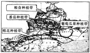 1、单选题 近年来,新疆特色农业发展得红红火火、蓬蓬勃勃。读新疆特色农业种植带分布图,回答1~3题。