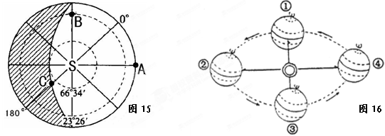 (4)图15所示的日期,地球位于图16中的 (填数字序号)位置,此时地球的
