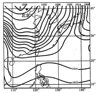 (1)描述中国大陆东部地区的等压线分布特点并说明A气压中心的形成原因。(4分)