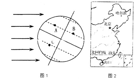 4、综合题 读图1 “太阳光照地球示意图”和图2“中国部分区域图”,完成下列要求。