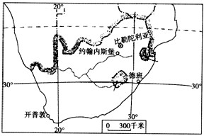 2、单选题 第19届世界杯足球赛于2010年6月11日至7月11日在南非共和国的开普敦、比勒陀利亚、约翰内斯堡、德班等9座城市举行。结合下图,回答1—3题。
