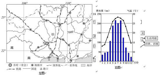 2006年,我国实施“东桑西移” 战略,把蚕茧主产区从东部的广东、浙江、江苏等省逐渐向中西部地区转移。左图中的甲自治区在接受“东桑西移”的过程中桑蚕产业发展迅速,近年来蚕丝产量已经稳居全国第一。右图为N市的气温曲线和降水柱状图。