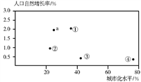 点评:本题难度较小。要求学生熟练掌握坐标图判读的同时,根据自然增长率=出生率-死亡率可推知各地自然增长率的高低。城市化带来的影响之一就是城市环境质量的下降。