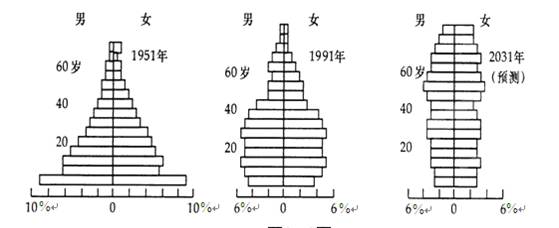 小题2:因0-5岁人口比重不断下降,表明人口增长速度减慢;20-40岁人口比重下降,就业压力将减小;性别比变化不大;而60岁以上人口比重不断上升,达到10%以上,所以人口的老龄化程度高。