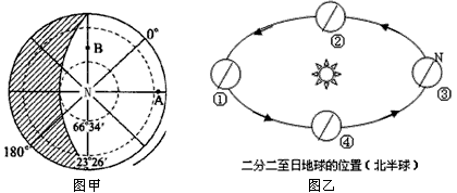 (2)图甲所示为北半球_________(节气日),日期为_________。此时,地球位于图乙中的_________