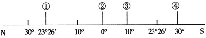 2、单选题 在30°E经线上①②③④四地各垂直竖立着一根高度相同的旗杆。读图回答1~4题。