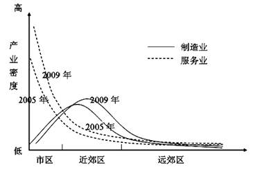 小题1:从图中看与2005年相比市区服务业的产业密度有明显提高,说明市区的服务业进一步集聚;从图中看与2005年相比,2009年制造业在向外缘移动,主要分布在近郊区,说明市区的制造业向郊区迁移;郊区因为制造业的发展,非农业人口增加,服务业也有所发展,因此本题的正确答案为D。