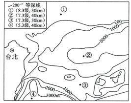 小题2:海啸是一种巨大的海浪。一般,当海底浅源大地震(震源深度小于50 Km,震级大于里氏6.5级)造成大洋地壳局部隆起或陷落,并且带动震源上方的深层(水深不小于1000m)海水做大规模扰动时,就可能发生灾害性海啸。若图中的四次地震都造成了地壳陷落,则四地中最可能发生灾害性海啸的是