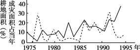 3、单选题 该图为广东省1975~1995年干旱、洪涝、台风、风暴潮农田成灾面积率过程线图。读图完成14~15题。