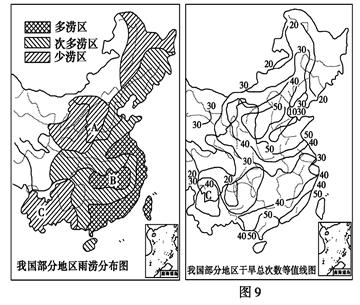 材料二:读《我国部分地区雨涝分布图》和《我国部分地区干旱总次数等值线图》,