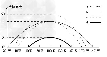 1、单选题 下图为某日a 、b 、c 、d 四条纬线上太阳高度随经度的变化图。读图,完成1~2 题。