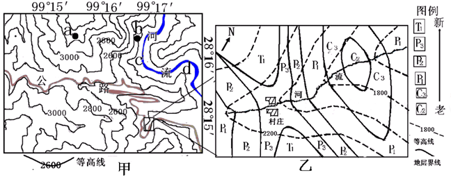 【小题1】根据图中等高线数值分布可以判断该区域地势西北高东南低,河流cd段的流向应为由c流向d。A错。河流c处的西岸为凹岸,受河水侵蚀作用明显,东岸接受流水沉积作用,故c处河水应深于对面的东岸。B正确。a、b之间地形为山脊,并且由a(海拔较高)到b点(海拔较低),等高线先疏后密,为凸形坡,所以a、b间通视度较差。C错。在乙图C2处岩层年龄中间老,左右两翼新,地质构造为背斜。在地形上该处为河谷地形,由此推测该背斜顶部受到了侵蚀,但不能确定为流水侵蚀造成的,其他的外力作用也有可能。D错。