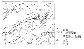 点评:本题难度一般,属于等高线地形图的常规性试题,适宜高一基础测试,注意利用指向标判断河流的流向,并能结合等高线的局部弯曲判断局部地形。