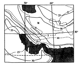 下面是波斯湾及附近地区一月(虚线)、七月(实线)等温线图,读图回答问题。