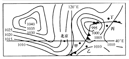 4、单选题 下图为某地区气压及相关天气系统分布图。据此回答1~2题。