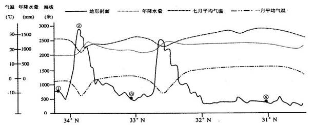 3、单选题 下图是沿106、5°E的地形剖面及相关气候资料图,据图判断各题。