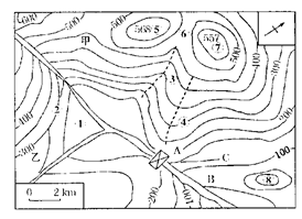 3、单选题 下左图是某地地形图,MN、PQ是地形剖面线。①、②是水库,若从中选择一个作为自来水厂的水源地,其条件是自流引水且工程建设费用最小。完成下列各题。