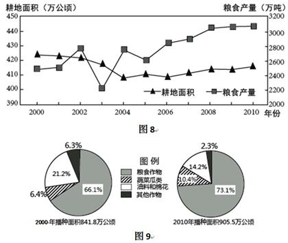 4、单选题 图8表示2000~2010年安徽省耕地面积和粮食产量变化,图9表示2000年、2010年安徽省农作物播种面积结构。完成问题。?
