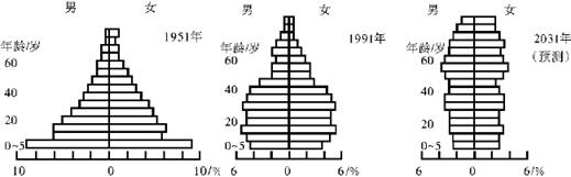 5、单选题 图为某地区不同时期人口年龄结构图。读图并结合所学知识,完成题。