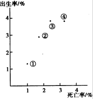 4、单选题 ? 甲市2008年户籍人口出生9.67万人,出生率为0.699%;死亡10.7万人,死亡率为0.773%。甲市户籍人口这种自然增长态势已持续14年。下图显示四个地区的人口出生率和死亡率。据此完成1—2题。