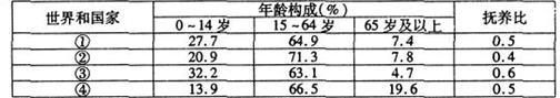 小题2:由上题知:②国为中国,再根据表中15—64岁中青年人比重大,所以抚养比最低,B正确。