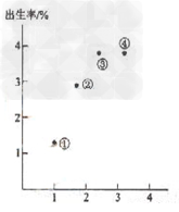5、单选题 甲市2008年户籍人口出生9.67万人,出生率为0.699%;死亡10.7万人,死亡率为0.773%。甲市户籍人口这种自然增长态势已持续14年。图上显示四个地区的人口出生率和死亡率。读图,回答1—2题。