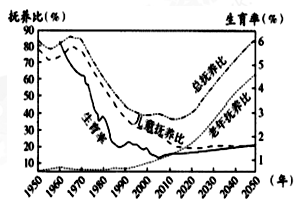 1、单选题 2013年12月28日十二届全国人民代表大会常务委员会第六次会议经表决通过了关于调整完善生育政策的决议,同意启动实施一方是独生子女的夫妇可生育两个孩子的政策。这意味“单独二胎”政策正式获批。读某国历年生育率和抚养比示意图,回答下列各题。