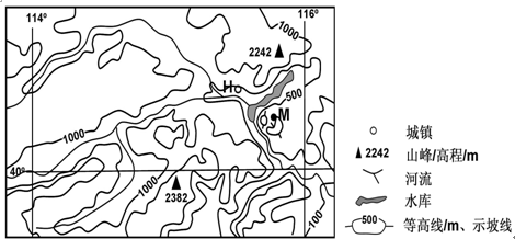 在湿润和半湿润地区的湖畔、河边和海滨,偶见规模较小的沙丘群,其形成的主要条件为所在地区沙源丰畜、多风、植被稀疏。下图所示区城中,M处发育了规模较小的沙丘群;H县城附近是著名的风口,冬春季节风力尤为强劲;河流发源于黄土高原地区。